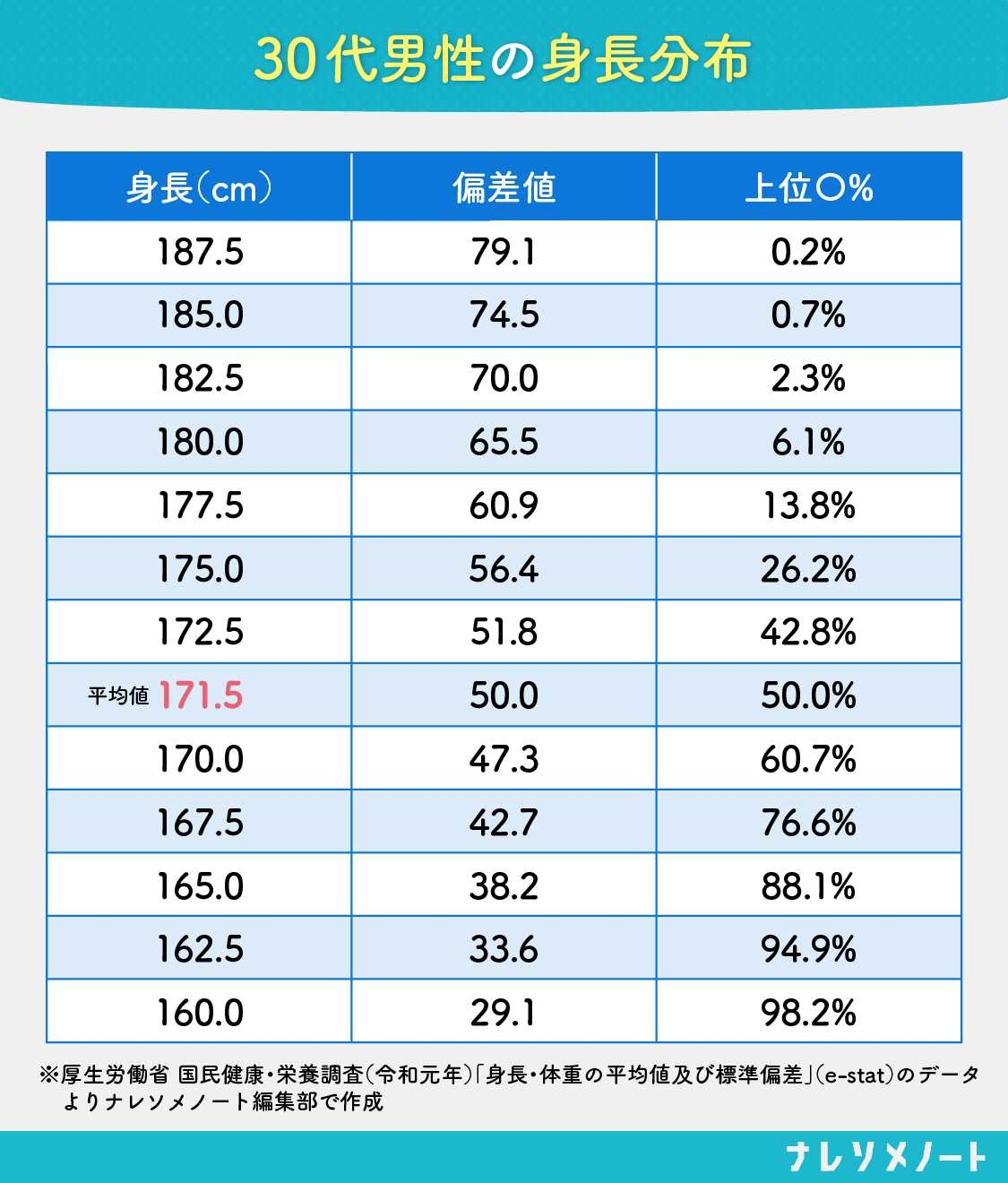 厚生労働省が調査したこちらのデータの平均身長と標準偏差から計算した上の表をご覧ください。