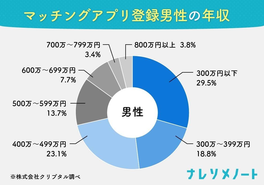 マッチングアプリなどの情報サイト「シッテク」を運営する株式会社クリプタルによると、マッチングアプリに登録している男性の71.4%は、年収500万円以下。
