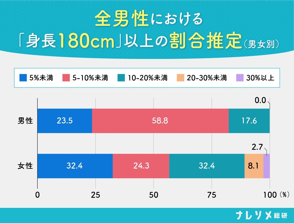 男性の回答に着目してみると、5%未満、及び5-10%未満が合計で82.3%という結果になりました。男性は、身長180cm以上の希少性を強く実感していると言えるでしょう。しかし、女性の回答では10-20%未満が32.4%を占め、20-30%未満、30%以上の回答も合わせて10.8%となっています。