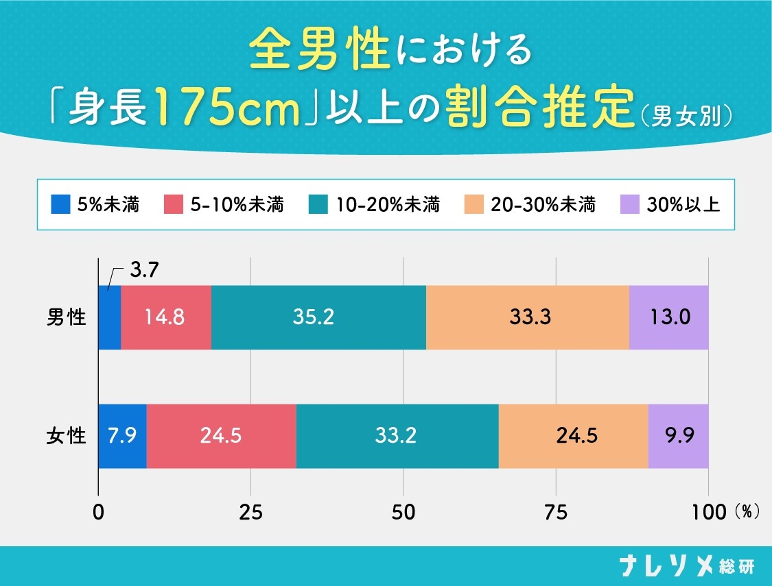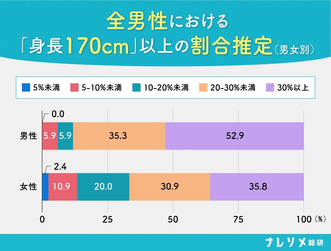 身長170cm以上のラインでは、男性では52.9%、女性では35.8%の人が「30%以上」と回答をしていました。なお、女性は30%以上と回答をした人が男性よりも17.1ppt低くなっています。男性に比べ、女性の方が「170cm以上の男性」の割合を少なく見積もる傾向が見られました。