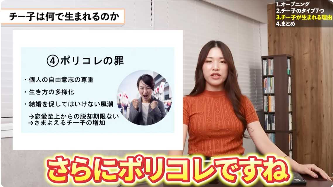 ポリコレの影響で「結婚する・しないは個人の自由」となった一方で、「結婚できるタイミングを逃さないための視点」すら奪われてしまったのが、現代のチー子増加の大きな要因の1つである。