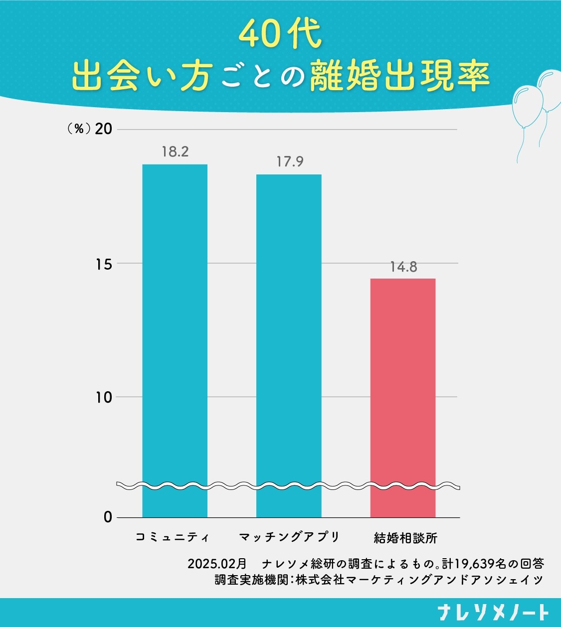 約20,000人(30代:7,979人、40代:11,660人)を対象に、出会いの方法ごとに結婚した人々の離婚率を徹底的に分析し、本当に「結婚相談所で結婚した夫婦は離婚しにくい」のかを検証したのです。