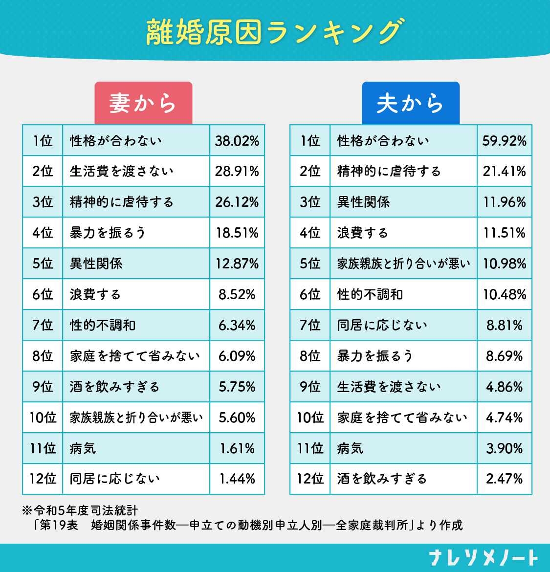 まずは裁判所が公開している、「令和5年の男女別離婚原因ランキング」を見てください。