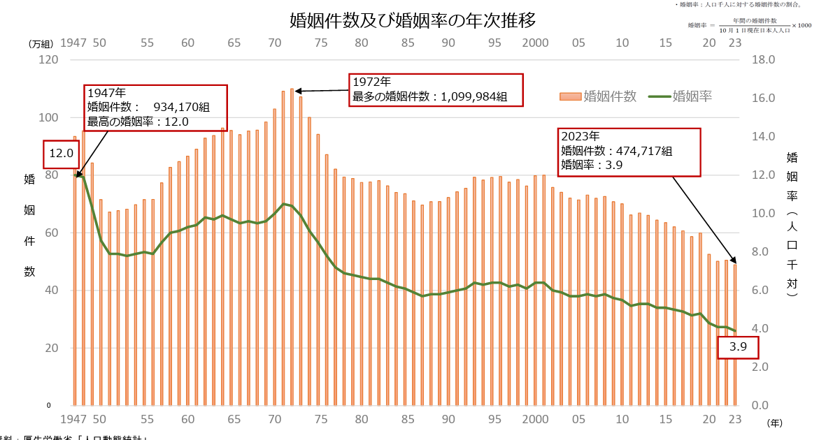 画像引用:こども家庭庁「結婚に関する現状と課題について」、厚生労働省「令和4年度「離婚に関する統計」の概況 人口動態統計特殊報告」