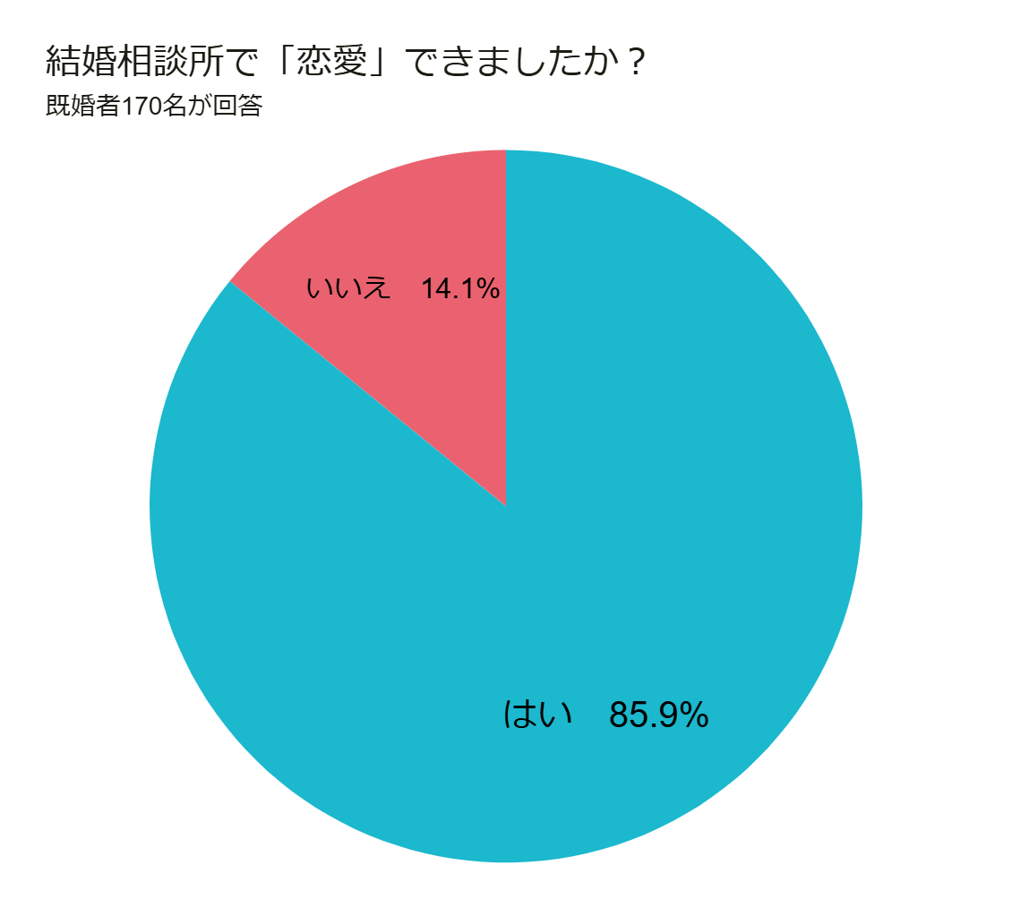 ナレソメ総研が行ったアンケートによると、結婚相談所を利用したことのある既婚者(回答数170名)の85.9%が「結婚相談所で恋愛できた」と回答しています。結婚相談所ナレソメ予備校の卒業生(成婚者)のほとんどが「恋愛して結婚した」と答えているというのは、結婚相談所の実態を知らない人からすると、意外な結果ではないでしょうか。