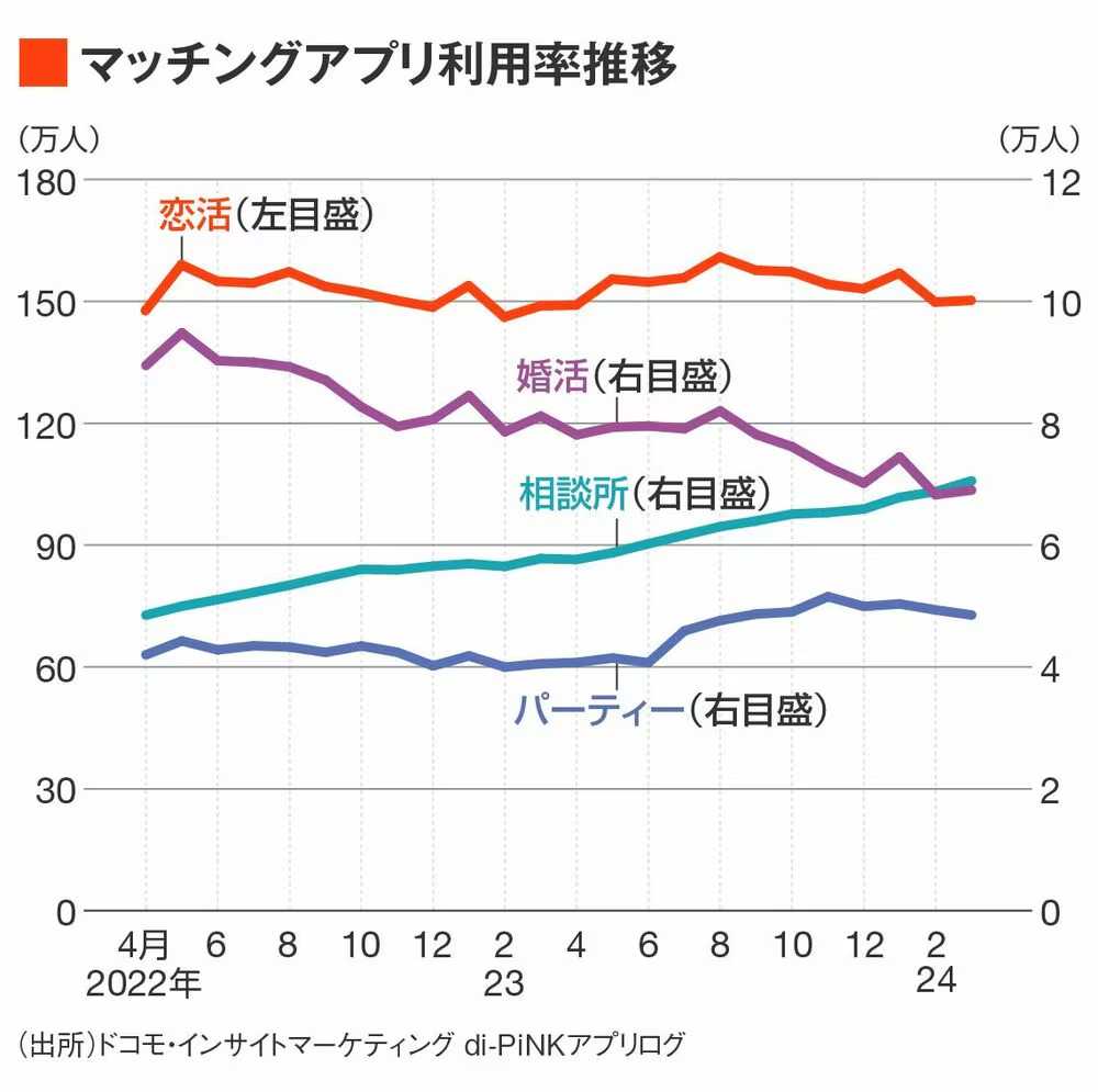 恋活にマッチングアプリを利用する層が横ばいなのに対し、婚活アプリの利用者は減少し、結婚相談所を利用する人が増えているのが分かります。マッチングアプリは「恋愛相手を探すにはいいけれども、結婚相手を探すのには向かない」と感じた若い人たちが、ここ数年、婚活アプリから結婚相談所に切り替え始めているのです。