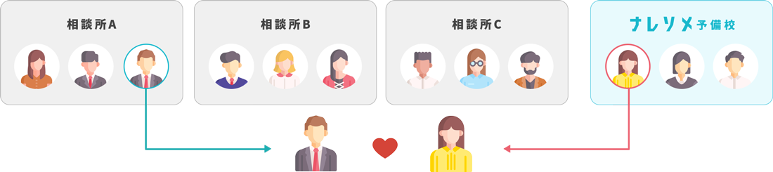 「ナレソメマッチング」とは、ナレソメ予備校独自の相性診断「マッチグラム」や「ラブスタイル診断」の結果を基に、自社会員の中から相性の良い相手をナレソメプランナー(仲人)が紹介するシステムのこと。