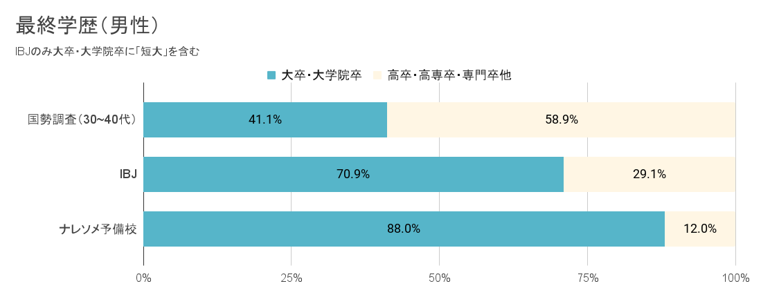 IBJ全体の男性会員のうち、大卒・院卒の割合は70%、結婚相談所ナレソメ予備校の男性会員では88%を占めます(2023年12月時点)。