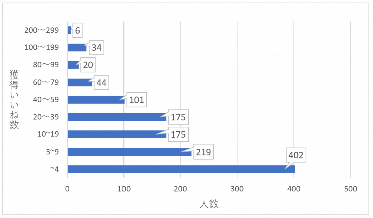 平均100件超の「いいね」をもらえる女性にとっては信じられないかもしれませんが、男性がもらえる「いいね」は平均20件程度(※2)。しかもごく一部のモテ男が平均を上げているだけで、「獲得いいね数4件以下」の男性がいちばんのボリューム層なのです。