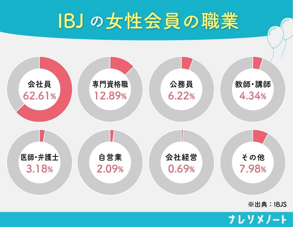 こちらは、IBJの女性会員の職業データです。会社員、公務員、専門職など、いわゆる「きちんと働いている人たち」が92.02%を占めており、非常に安心できる結果となっています。