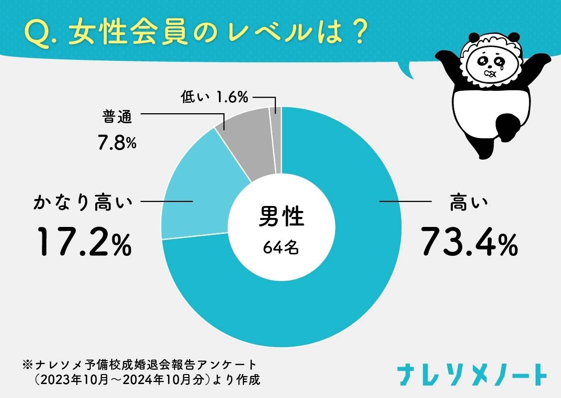 結婚相談所ナレソメ予備校を利用した64名の男性の実に90.6%が「女性会員のレベルが高い・かなり高い」と回答しています。こう聞くと、結婚相談所にも希望が持てますよね。