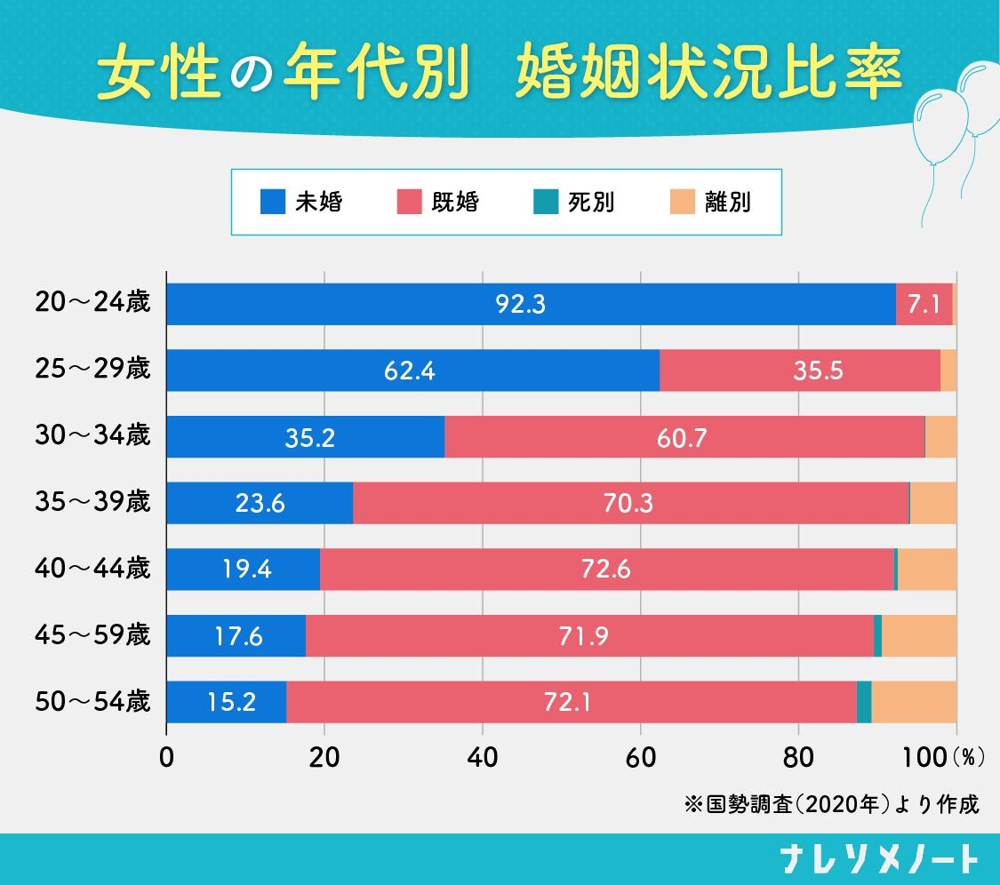 国勢調査(2020年)の結果からも、34歳までの年齢層では未婚率が大きく下がっていくのに対し、35歳以降に結婚する人は非常に少ないのが見て取れます。