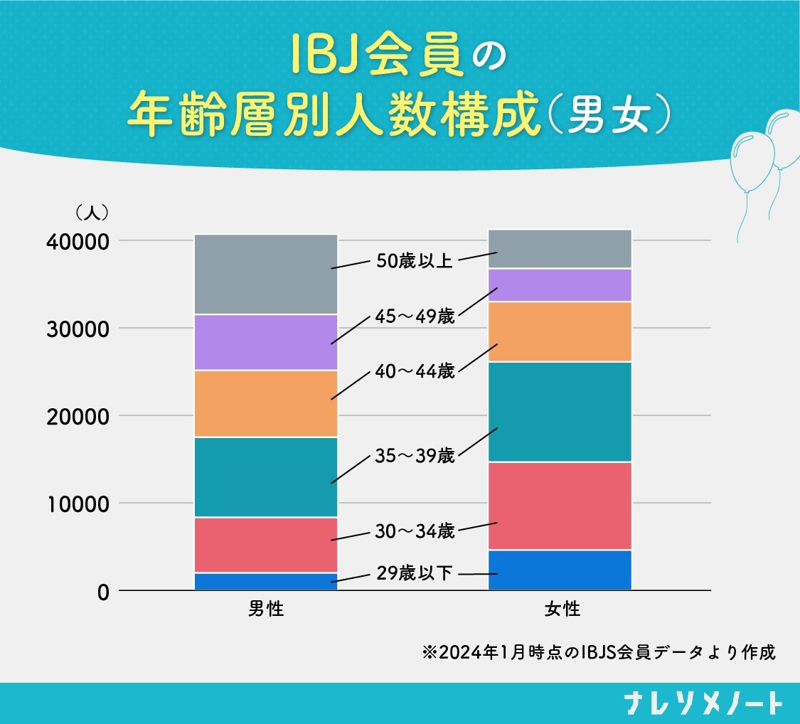 IBJの男女会員の人数分布を見てみると、全体的な会員数はほぼ同数ですが、女性は39歳以下が多く、男性は40歳以上が多い傾向があります。