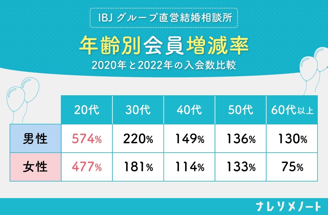 例えば、私たちも所属する国内最大級の結婚相談所連盟であるIBJの会員は、現在9万人超。冒頭でご紹介した新聞記事にもあったように、この数年で20代の若年層の登録が急増しています。